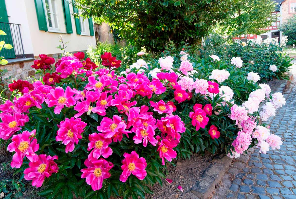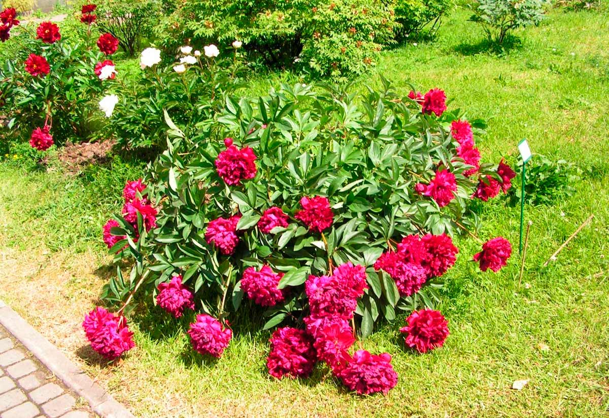 Кусты разноцветных пионов одной высоты вдоль садовой дорожки выглядят очень оригинально. Также их в ландшафтном дизайне можно использовать для создания невысоких живых изгородей, зонирования участка.