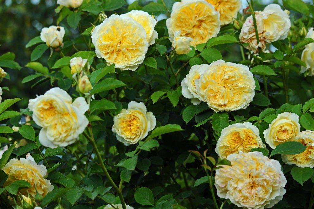 Английские розы выведены в Великобритании, с ее мягким, прибрежным климатом. Предпочитают более тенистые места. Они представляют собой результаты сложного скрещивания флорибунды, чайно-гибридных и некоторых других видов роз. Расстояние между кустами зависит от сорта и может составлять от 50 до 100 см. Прививку заглубляют на 8-10 см. Ветви укорачивают не больше, чем наполовину, а компактные сорта – на 1/3.