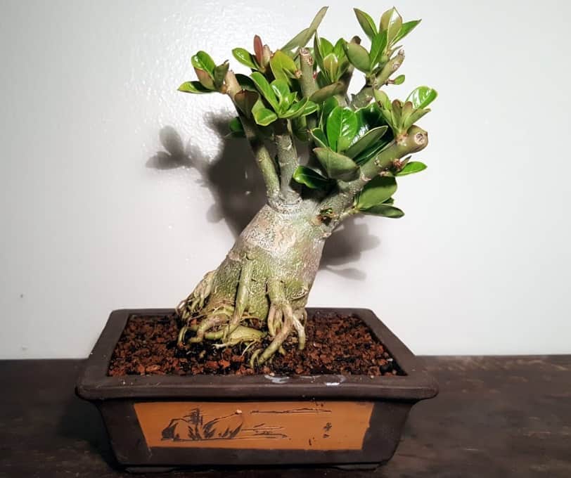 | Особенности выращивания | Растению обязательно устраивают период покоя зимой с содержанием в прохладном помещении. Корневая система деревца интенсивно развивается и постепенно «выталкивает» растение из почвы. Когда растение возвысится над уровнем субстрата на 1,5 см, его корни следует подрезать. Деревце достают из горшка, удаляют боковые корешки. Места среза посыпают угольным порошком. Адениум пересаживают в новую емкость. Весной проводят формообразующую обрезку. |