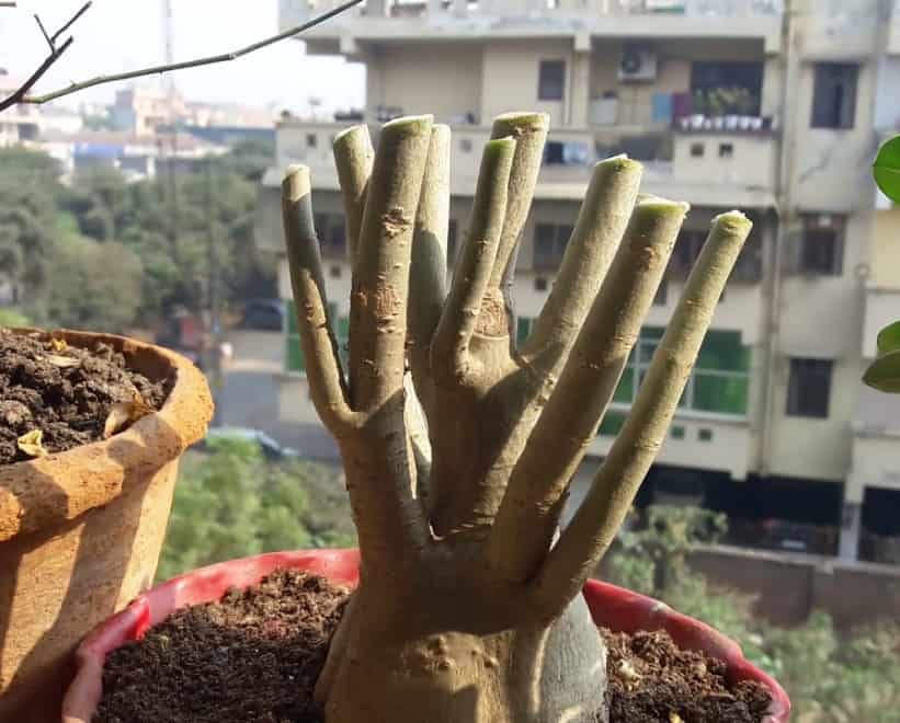 При формировании кроны можно как удалять ветки, так и переплетать их. Какой формы получится адениум после этих процедур, зависит только от фантазии цветовода.