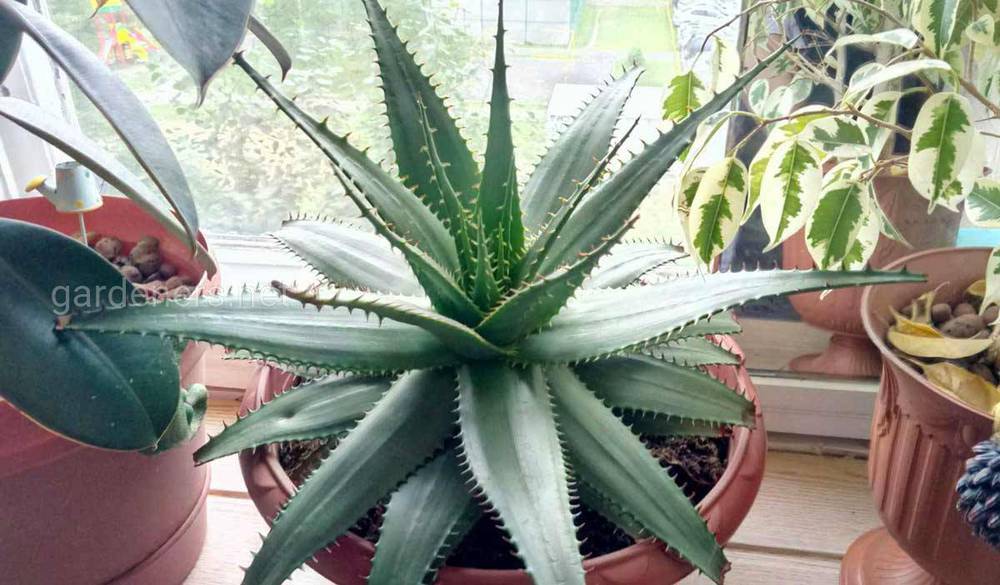 Очень симпатичный кустик серо-зеленого цвета. Листья обратнояйцевидные, шириной около 12 см., длиной достигают до 30 см. Сочные листья окаймлены острыми зубчиками бордового цвета, весьма колючие, а на острие листа колючка около 2 см. Родом этот вид их Центральной Америки.