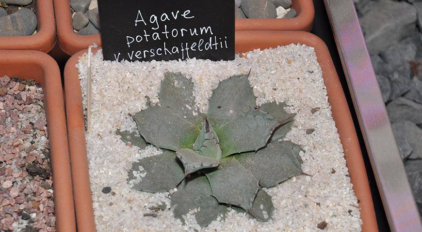 - Агава потаторум, Agava potatorum, или агава ПЬЯНИЦ – крупное растение (от 0,3 до 1 м в диаметре) с довольно широкими листьями, покрытыми серебристым восковым налетом.