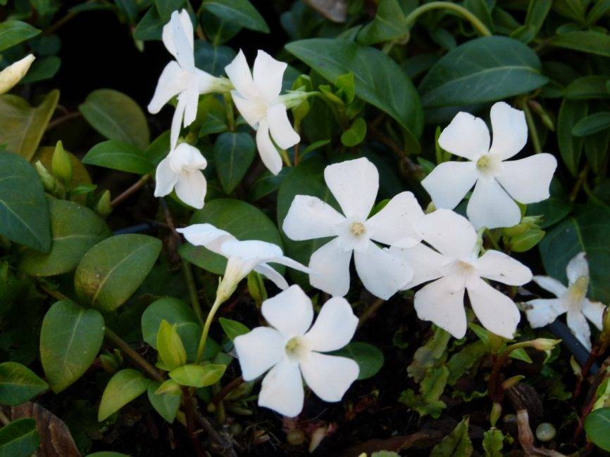 - Барвинок обыкновенный “Alba” — куст этого сорта дает цветы белого цвета, приятно сочетающиеся с темно-зелеными листьями. Вечнозеленый, обильно цветет с апреля по май, затем появляются одиночные цветки, украшающие растение на протяжении всего лета. Альба растет до 15 см в высоту. Необходимыми требованиями являются умеренно влажная гумусовая почва и тенистое положение.