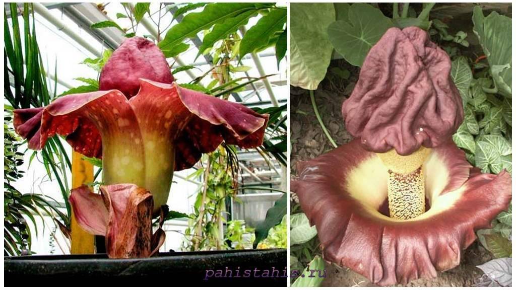 Лепесток 70-80 см длиной, зеленый снаружи, коричнево-пурпурный внутри. Растет в муссонных лесах острова Суматра. Это экзотическое растение гигантских размеров не встречается в комнатной культуре.