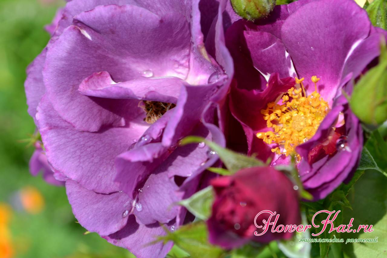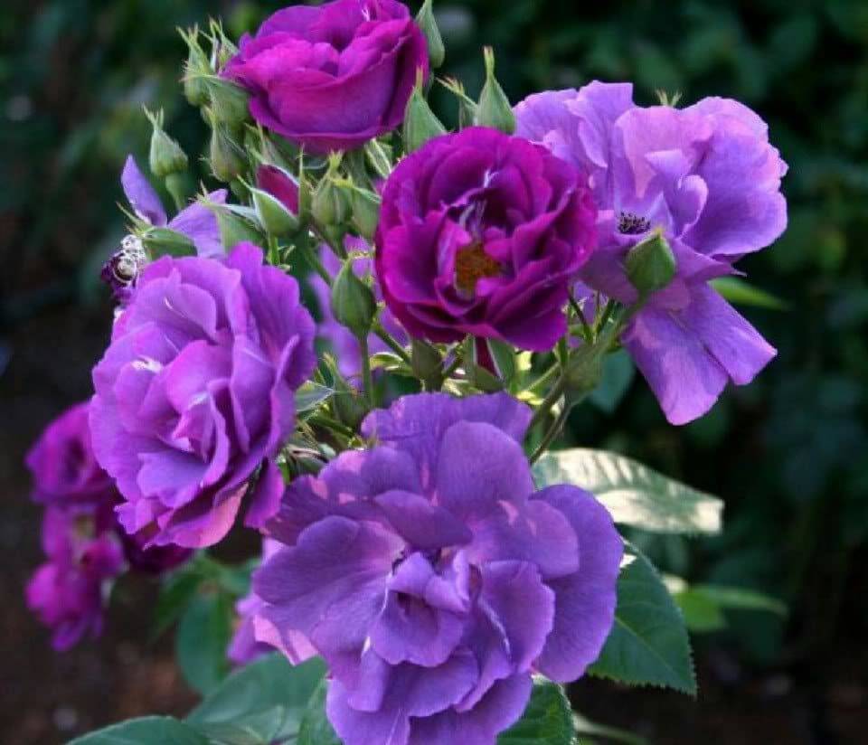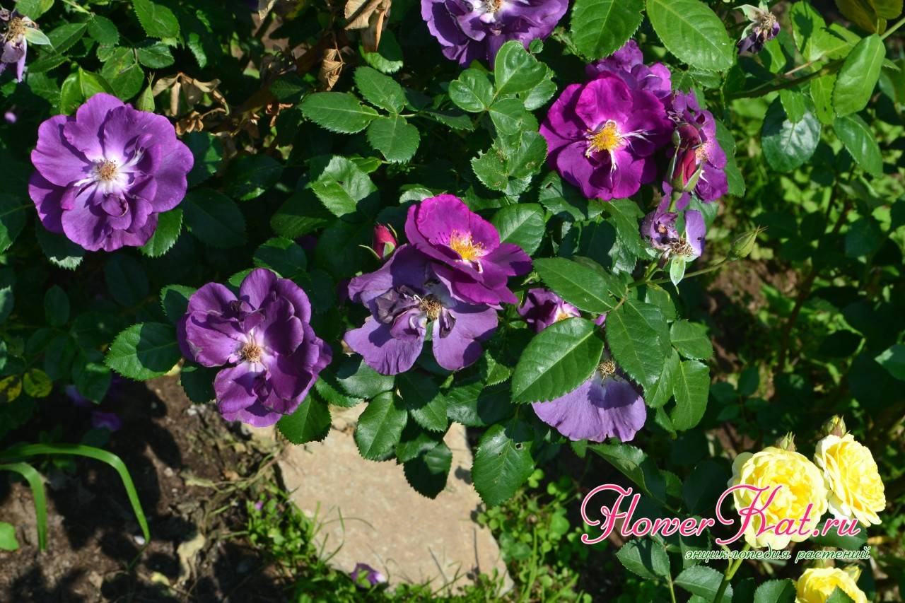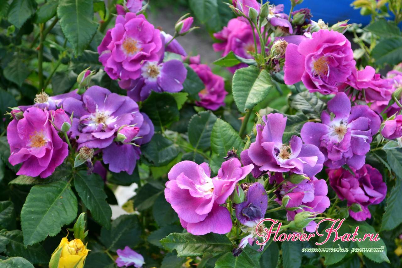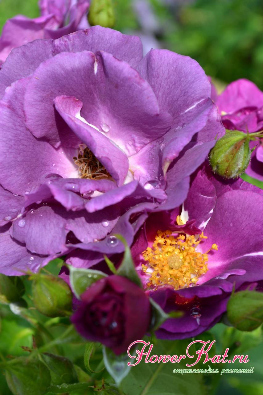 Бутоны собраны в кистевидные соцветия, в каждом из которых может быть до 4-7 цветков. В зависимости от места посадки, количества освещения, погодных условий) окрас лепестков этой розы может меняться от пурпурного до пурпурного с синим отливом.