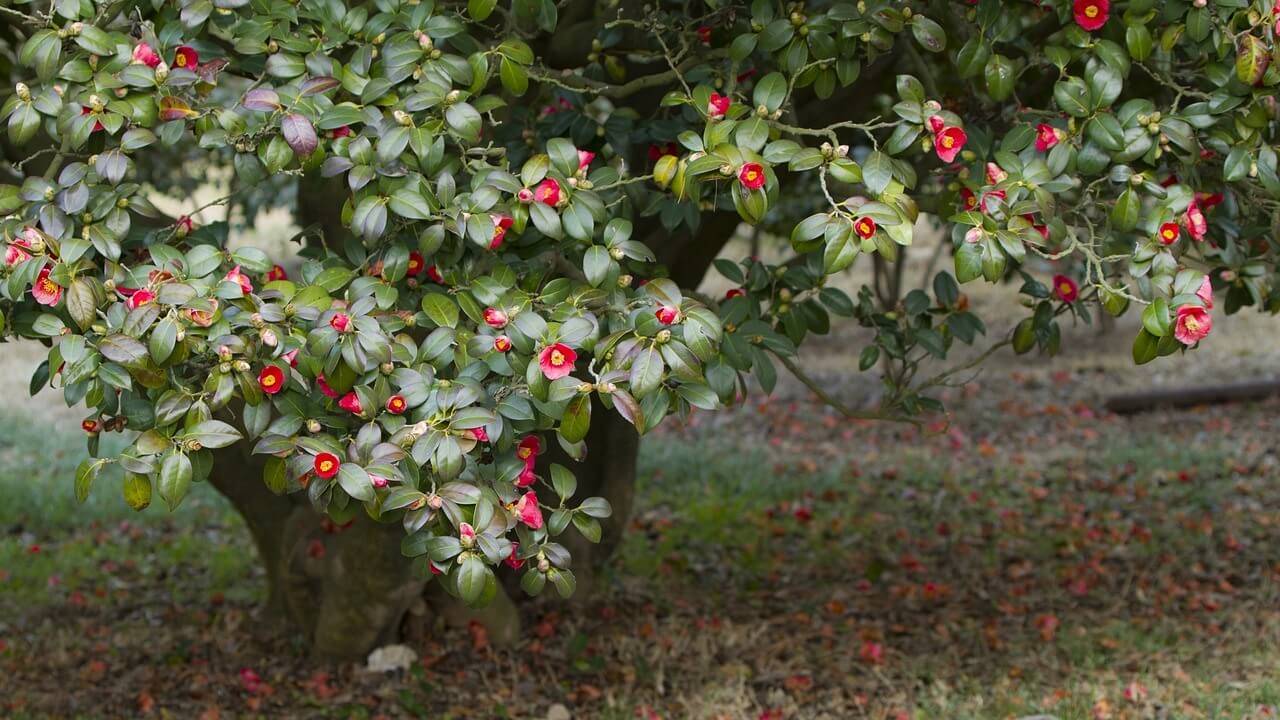Камелия японская (Camellia japonica). В естественных условиях данный вид водится в лесах Китая, Японии и Кореи. Эти кустарники или деревья в высоту могут доходить до 15 метров. Блестящие, кожистые листочки темно-зеленого цвета имеют зубчики по краю и являются остроконечными на вершине. Форма у них эллиптическая или яйцевидная, а в длину листья вырастают до десяти сантиметров. Простые цветочки в диаметре доходят до 4 сантиметров и могут расти как отдельно, так и по несколько штук. Водятся цветки полумахровые и махровые, а пигментированы они в розовый, красный или белый цветовой оттенок, а также водится и пестрая окраска. Расцветает с декабря и по апрель.
