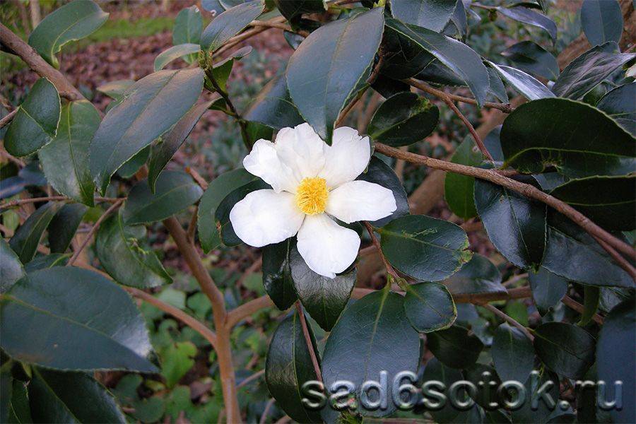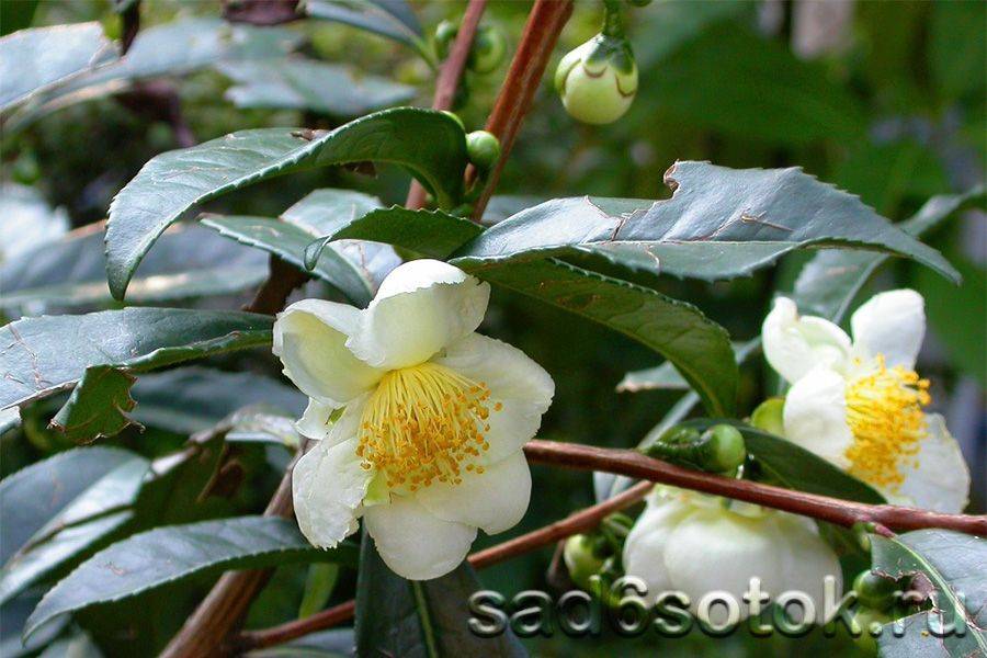 Этот вид также известен как чайное дерево. Из его молодых листочков изготавливают привычный для всех черный и зеленый чай, а ароматные цветки используют как добавку.