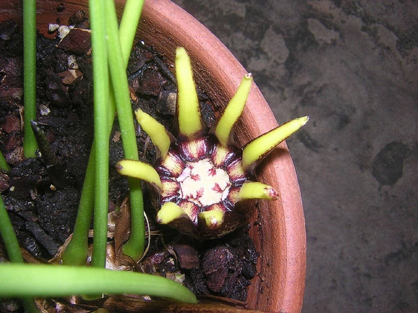 Цветение происходит редко и не длится долго. Поскольку цветки и плоды образуются на корнях, на них может скапливаться влага при поливе. Старайтесь избегать этого, чтобы не создать благоприятную среду для вредоносных бактерий.