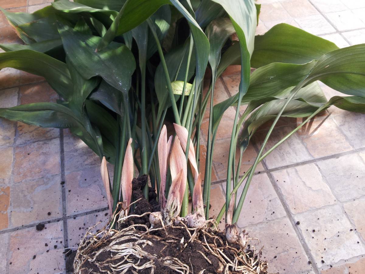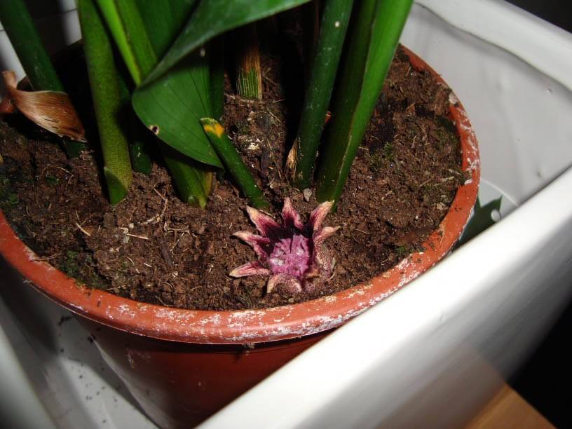 Будет не лишним снять немного грунта над корневищем, если оно чрезмерно заглублено. Часто цветоводы пропускают цветение аспидистры. Поскольку бутоны просто не могут пробиться через уплотненную почву, или длины черенка не хватает для преодоления слоя субстрата.