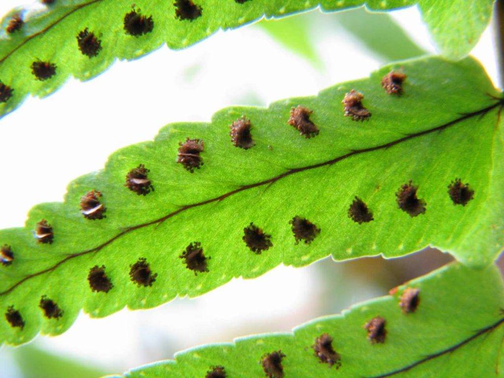 Если перевернуть лист, то можно увидеть споры. Они похожи на чёрточки, которые находятся по обе стороны от продольной жилы.