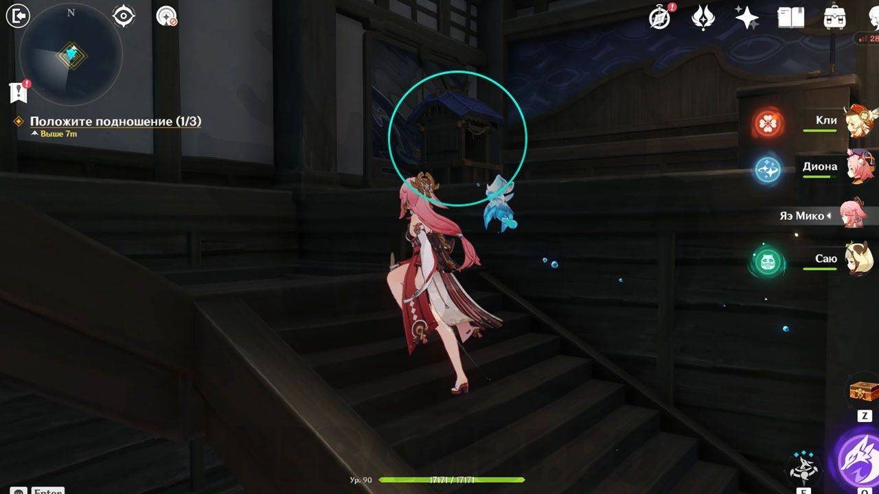 Поднимаемся дальше и находим вторую Омамори. Ее тоже нужно поднести к святилищу справа от лестницы.