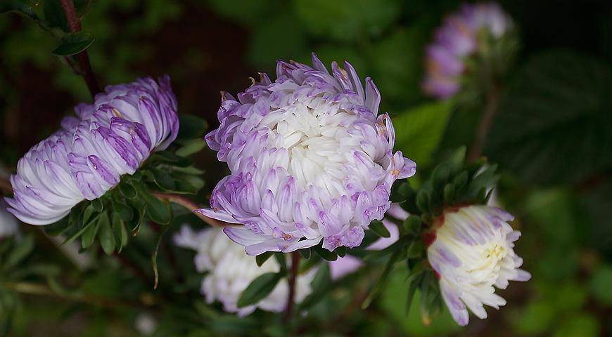 Серия астр с пирамидальным кустом, высотой 60-70 см, с пионовидным цветками диаметром до 8-10 см. Самые известные сорта: Старый Замок Серебряный – белый с синими подпалинами, Старый Замок Шамоа, Старый Замок Кварцевый – белый с фиолетовыми подпалинами (Седая Дама – версия этого сорта).