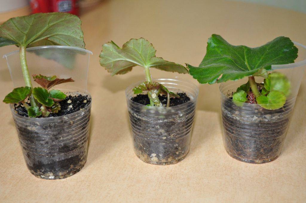Как только появятся корешки, молодое растеньице нужно посадить в грунт. Переросшие корни легко обламываются, и бегония может не приняться.