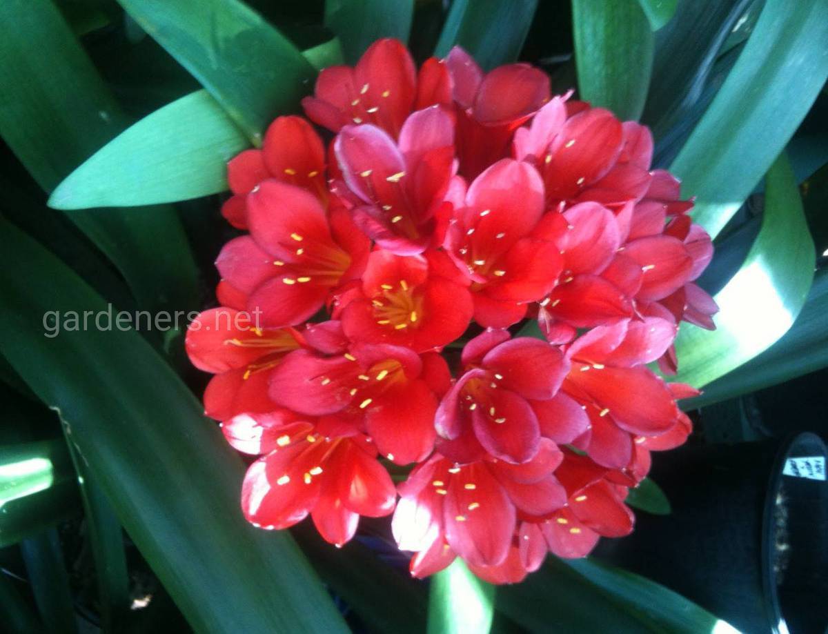 Кливия Гардена. Цветок носит имя майора Роберта Гардена, который его открыл в 1856 году. Отличается от своих собратьев длинными ярко-зеленными листьями, высотой до 50 см. У них гладкая темно-зеленая поверхность, покрытая рельефными полосами. Край листочков заостренный. Цветочная стрелка прямостоящая, длиной около 50 см. На ней распускается до 15 маленьких красных колокольчиков;