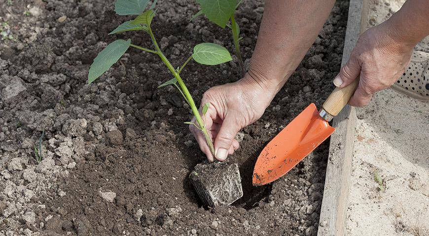 Пересаживание ростков: сеянцы осторожно вынимают из емкости с землей и углубляют до первого листка в лунки. Почву притрамбовывают, поливают и мульчируют.