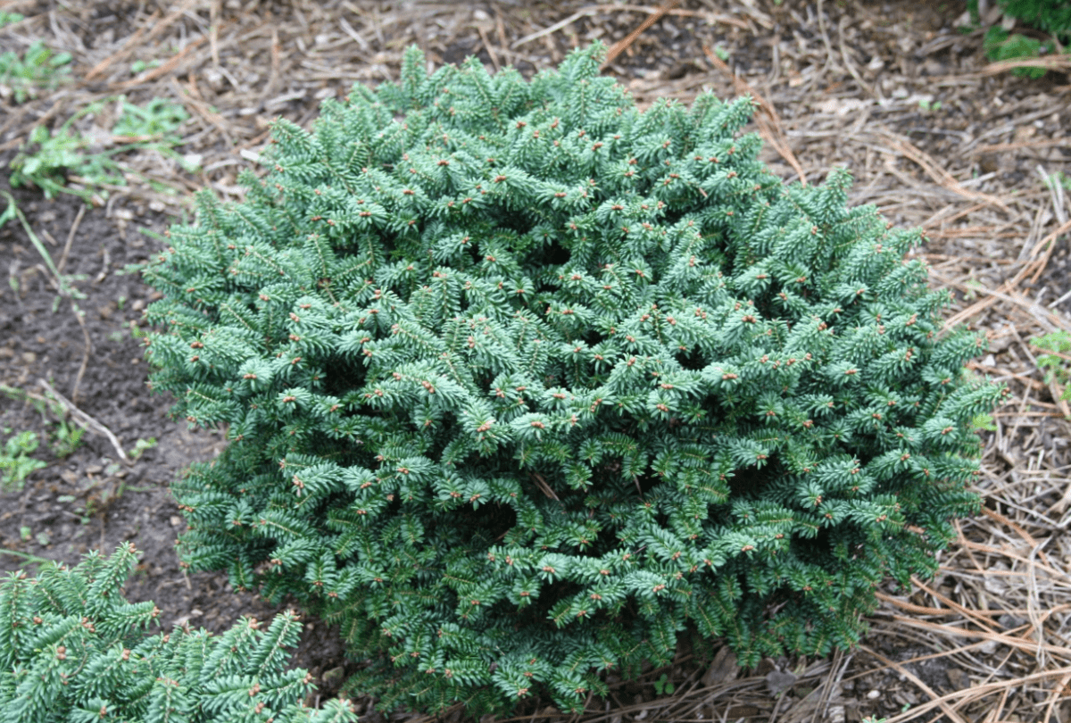 - Ель Пуш, дерево-куст, обладательница густой кроны. Взрослое деревце имеет высоту 30 см, а диаметр кроны 60 см. Плоды — шишечки красно-фиолетового цвета.