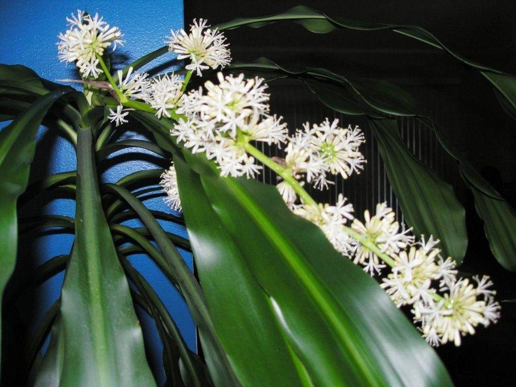 Листики могут быть как пестрыми, так и серо-зелеными с голубым оттенком, длинные (до полуметра) и не широкие (от 2 до 4 сантиметров). Зеленая масса покрывает только верхний слой стебля. Нижние листики со временем желтеют и опадают, оголяя ствол. Корневая система прямая и гладкая, темно-желтого или оранжевого цвета. Соцветия по виду напоминают метелки. Цветочки кремово-зеленые или белые, похожи на звездочки.