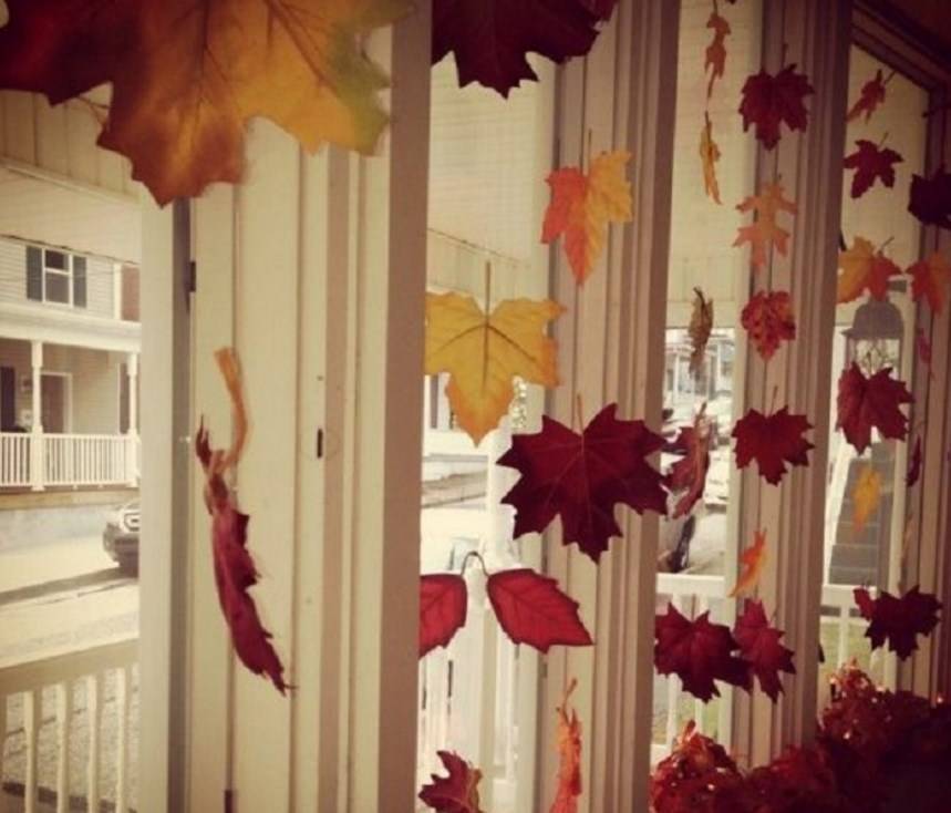 - Украшение для окна. Чтобы сотворить интересную аппликацию, необходимо взять много осенних листьев разной формы и цвета, а также клей и большой лист бумаги. Из бумаги вырезают разные формы – сердечки, капельку, цветы. Затем на эти фигурки клеят разные осенние листья. После того как аппликация высохнет, ею декорируют стекло.