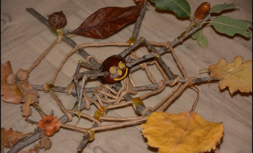 «Паучок». Для изготовления композиции понадобится взять 8 ровных тонких веточек, белую нить, осенние листья, каштан, картон и клей. На картон необходимо приклеить 8 веточек, соединяя в центре, это будет основа нашей паутины. Далее с помощью нитки сделать саму паутинку и приклеить к ней в произвольных местах листочки. По центру нужно поместить листочек, а к нему прикрепить половинку каштана. Это и будет паучок, к которому надо приклеить маленькие ножки, то есть тонкие и короткие веточки. Эта поделка очень простая, но смотрится довольно оригинально.