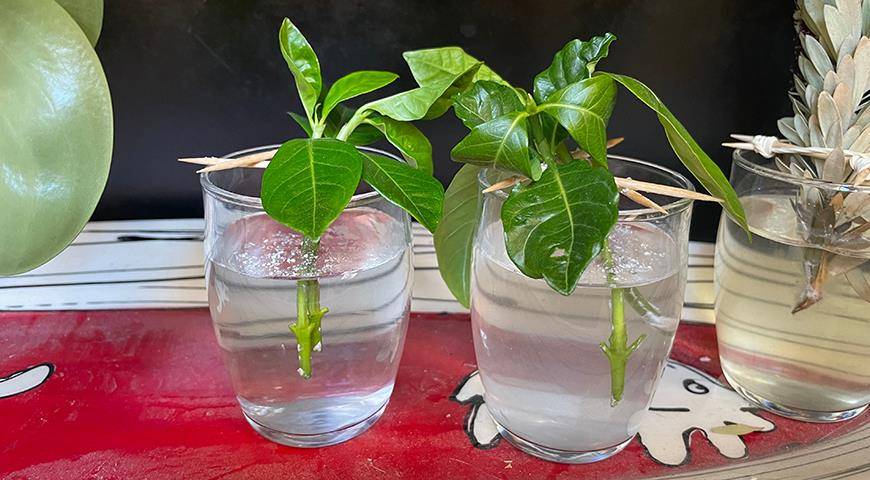 - В воде можно оставить отростки до появления корешков, но лучше сразу высадить их во влажный питательный субстрат.