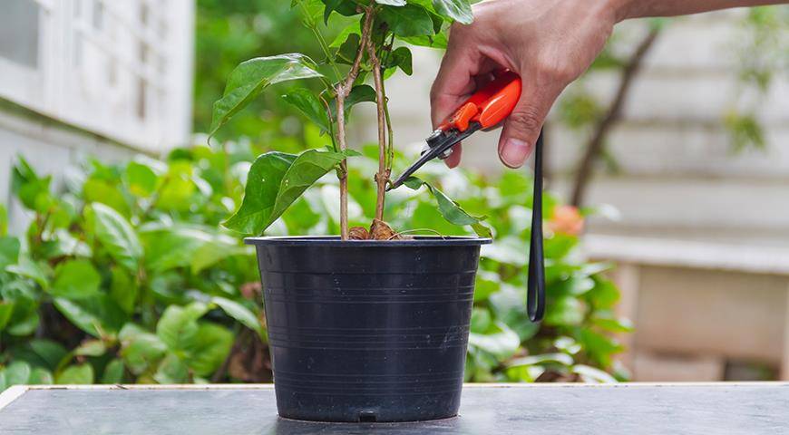 Для формирования красивого пышного куста и новых цветочных почек, после каждого цветения, гардению необходимо обрезать. Форму молодому растению создают с помощью прищипывания верхушек побегов.