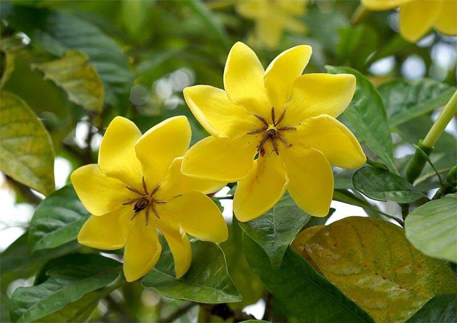- Гардения трубконосная (Gardenia tubifera): цветки желтые, однорядные, располагаются на длинных тоненьких цветоносах, за что вид и получил название