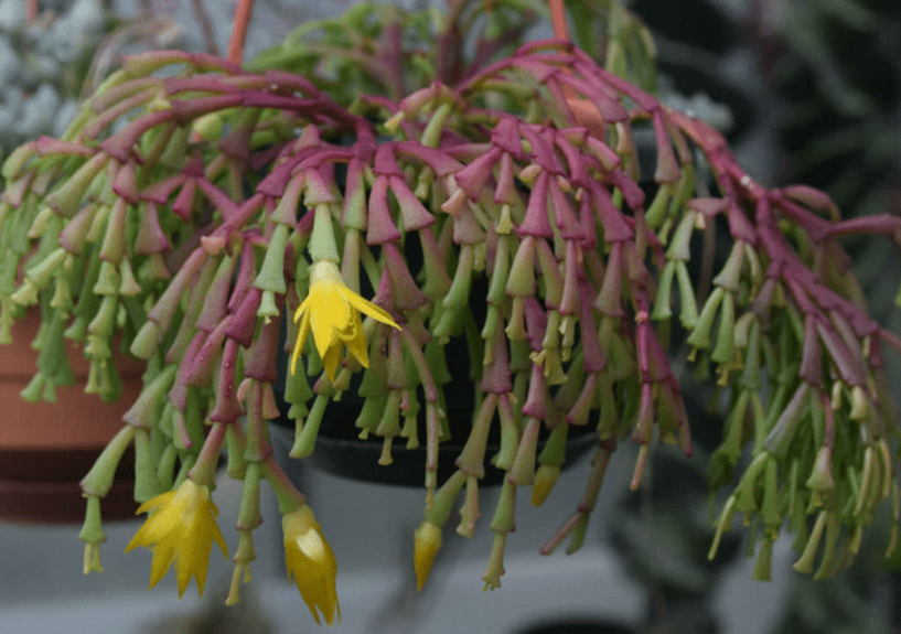 Один из самых редких и декоративных сортов, выведенный зарубежными селекционерами. Цветок отличается густым ветвлением – стебли поникшие, состоят из треугольных сегментов длиной 3-4 см. Окрас побегов в зависимости от разновидности бывает красного, алого, фиолетового цвета, у основания стебли зеленые.