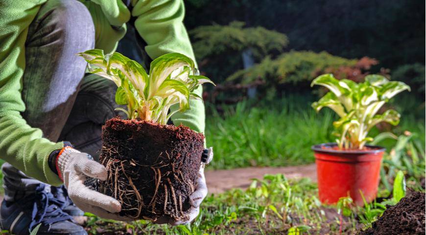 За 2 часа перед тем, как пересадить функию, нужно увлажнить почву. После куст следует обкопать по периметру, только не сильно близко к корешкам. Обкопанную хосту извлекают из почвы и очищают от земли. Это легко сделать, нужно только приподнять растение за стебли и стукнуть пару раз о землю.