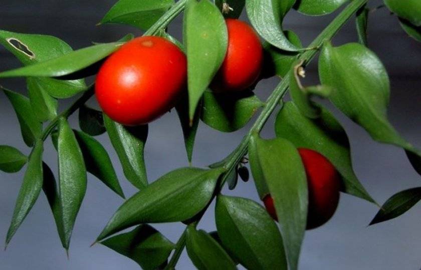 Как видите на фото, у итальянского рускуса цветки и плоды образуются на листьях или под ними.