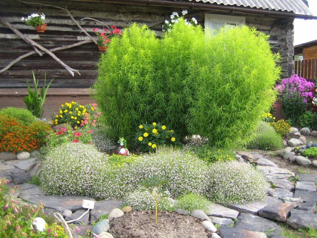 Отдельного внимания садоводов заслуживает ясколковидная гипсофила и другие виды невысоких плетущихся кустарников. Они широко используются для выделения границ той или иной зоны участка, украшения бордюр, оформления рокариев и альпийских горок. Очень красиво и естественно смотрятся каменистые декоративные утесы, усеянные мелкими соцветиями качима.