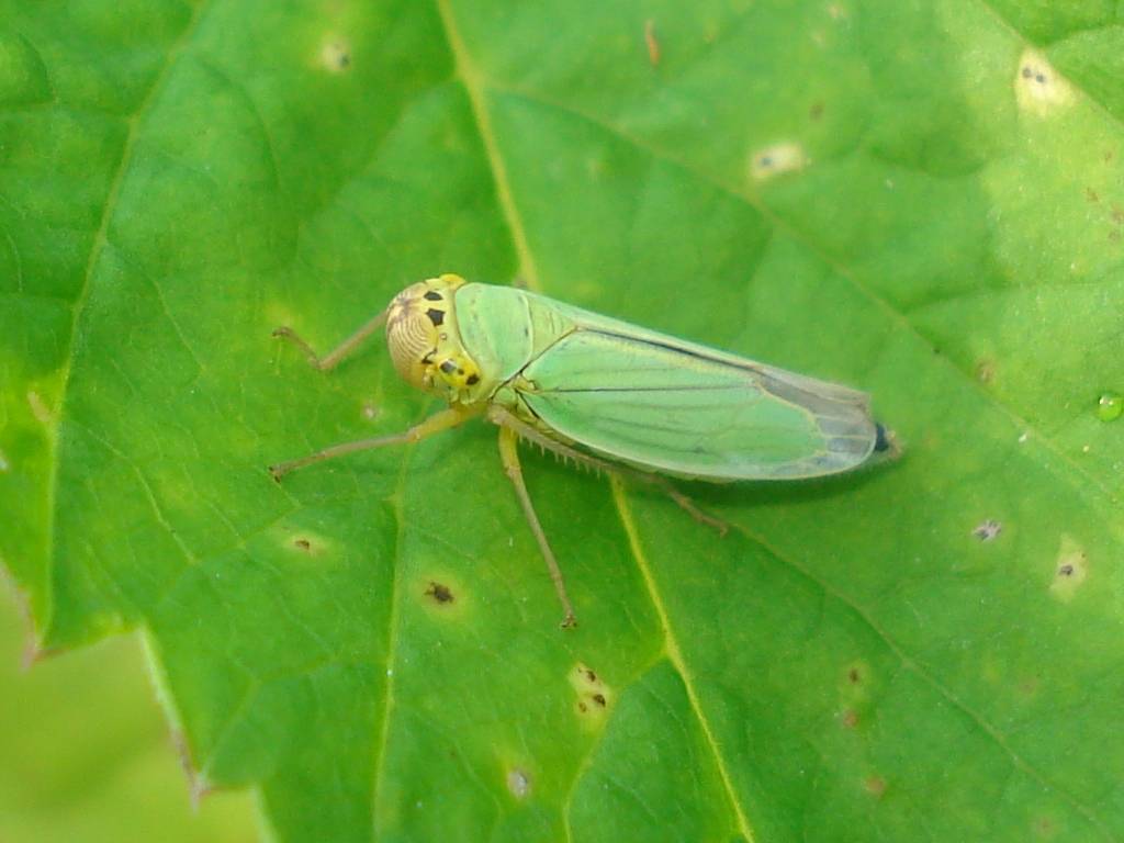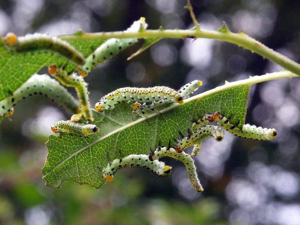 Это вредитель с вытянутым тельцем и желто-зелеными крыльями. Насекомое обгладывает листья, а личинки питаются соком листьев, отчего те вянут и желтеют.