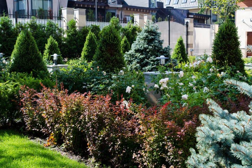 Такой палисадник можно оборудовать без помощи специалиста. Он будет украшать двор постоянно, а не только летом. Для этого достаточно разместить на участке хвойные, яркие лиственные и красивоцветущие растения.