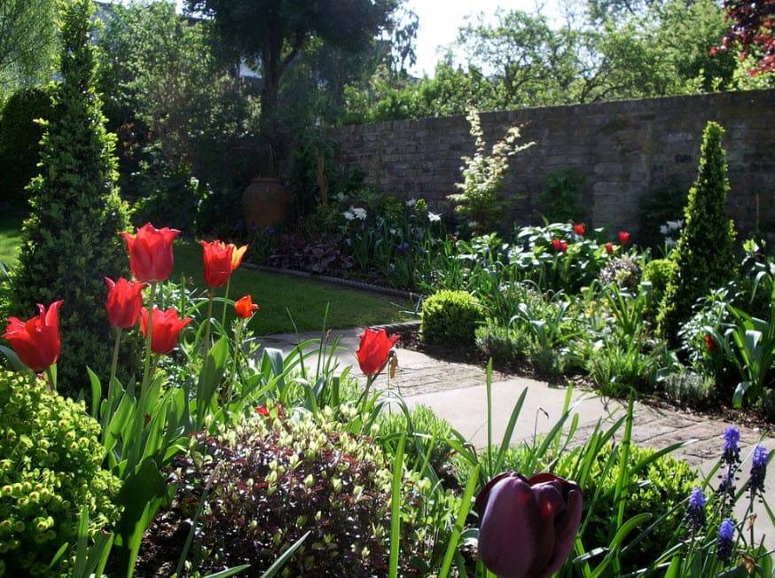 Чтобы зрительно увеличить пространство, используй плавные и сглаженные формы без резкой и агрессивной геометрии. Например, если дорожка – то петляющая между клумбами и кустарниками. Самые темные и отдаленные углы высветли белыми или желтыми цветами.