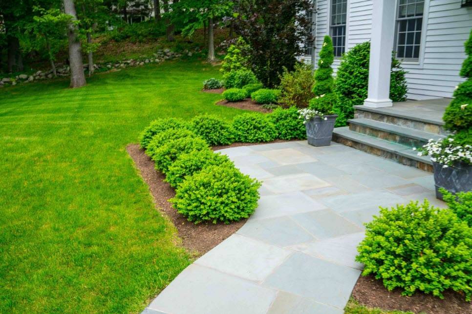 Первое, на что стоит делать упор – это площадь участка. Если она позволяет, то перед фасадом здания можно застелить газон с дорожкой, ведущей к дому, из декоративного камня.