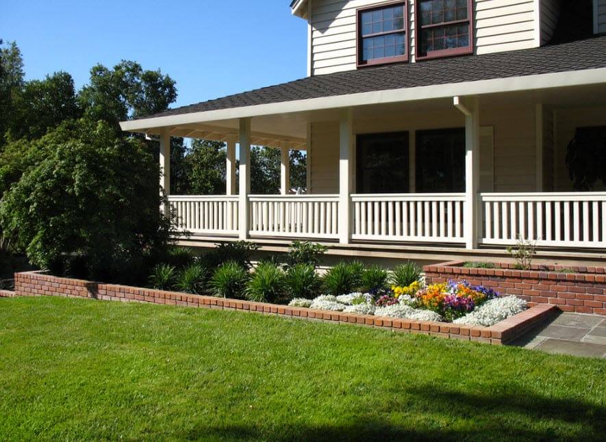Проще всего разместить на участке бордюрную клумбу вдоль стены здания, установить под окнами ящики и подвесить кашпо с цветами.
