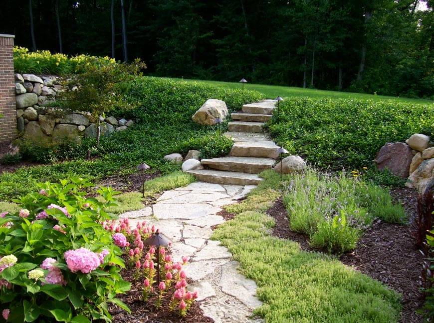 Если тебе достался участок со склонами, не спеши сгладить его всеми возможными методами – это идеальная база для альпийского стиля. Помимо того, что он очень живописный, он еще и неприхотлив, потому что для посадок используются нетребовательные многолетники. В оформлении используется много камня: дорожки, ограды, клумбы, ручьи и мостики, опоры, отсыпки и другие сооружения.