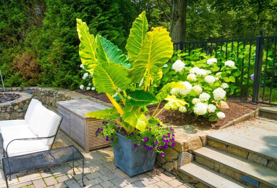 Декоративные горшки и кашпо, выполненные в современном направлении, бочонки и даже пень (если дом в деревенском стиле), придадут колорит и дополнят дизайн участка. Рядом можно построить простой, незамысловатый фонтанчик, небольшой искусственный водоем.