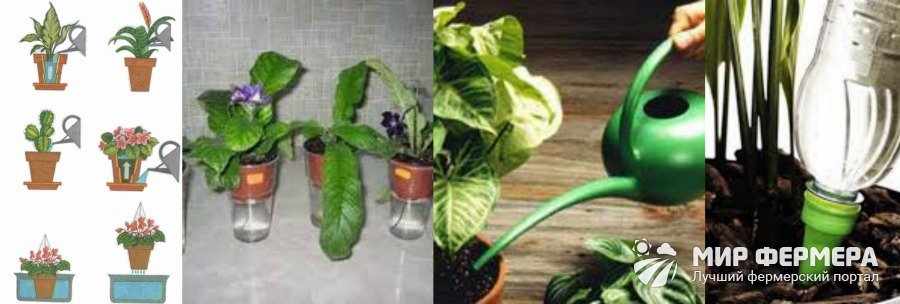 Перед отъездом хорошо и обильно полейте ваши растения. В данном случае лучше всего использовать метод погружения горшка в воду – это позволит почве полностью пропитаться влагой (напомним, края горшка должны быть выше уровня воды, чтобы она попадала внутрь только через отверстие на дне). Затем все растения нужно поместить подальше от окон и поближе друг к другу, что поможет сохранять влажность воздуха. Желательно, чтобы в комнате была полутень. Литья желательно проредить, убрать бутоны и распустившиеся цветы с растений (для видов, которых это не слишком травмирует, например, с бальзаминов). «Автополивалки» часто продают в магазинах, но их можно сделать и своими руками.