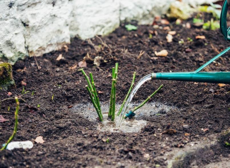 Молодые розы, недавно высаженные в открытый грунт, нуждаются в регулярных поливах. Орошать землю нужно 2-3 раза в неделю, выливая по 5 л воды на каждый саженец.