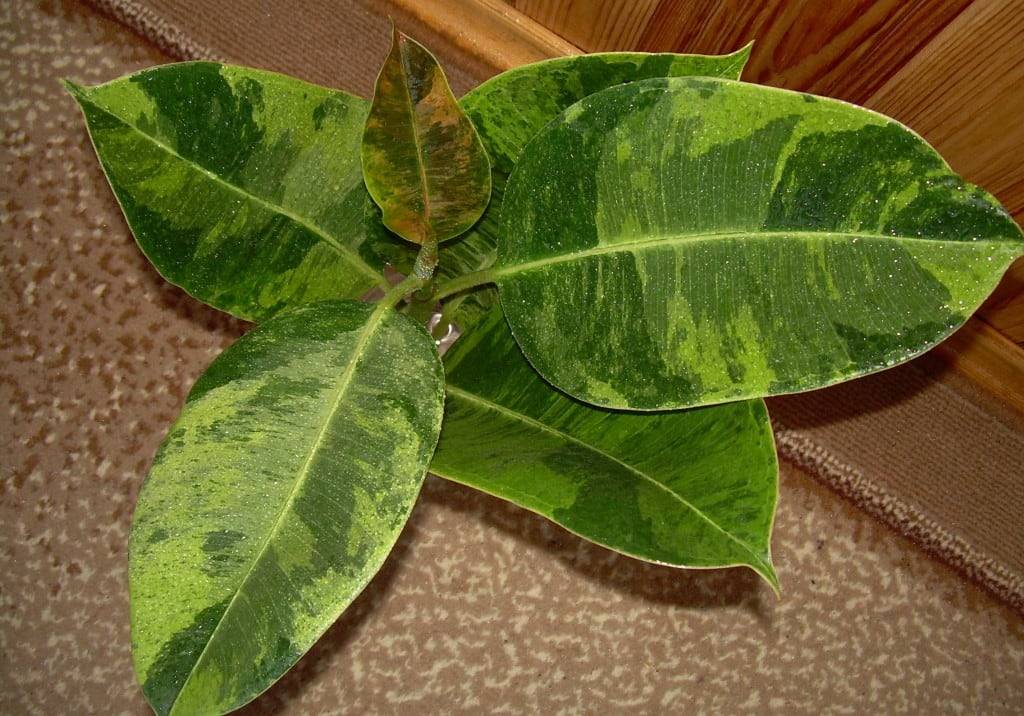 Фикус каучуконосный обычный формирует темно-зеленую листовую массу. Селекционерами выведены декоративные сорта с вариегатными листьями. Среди них наиболее известные в домашней культуре: