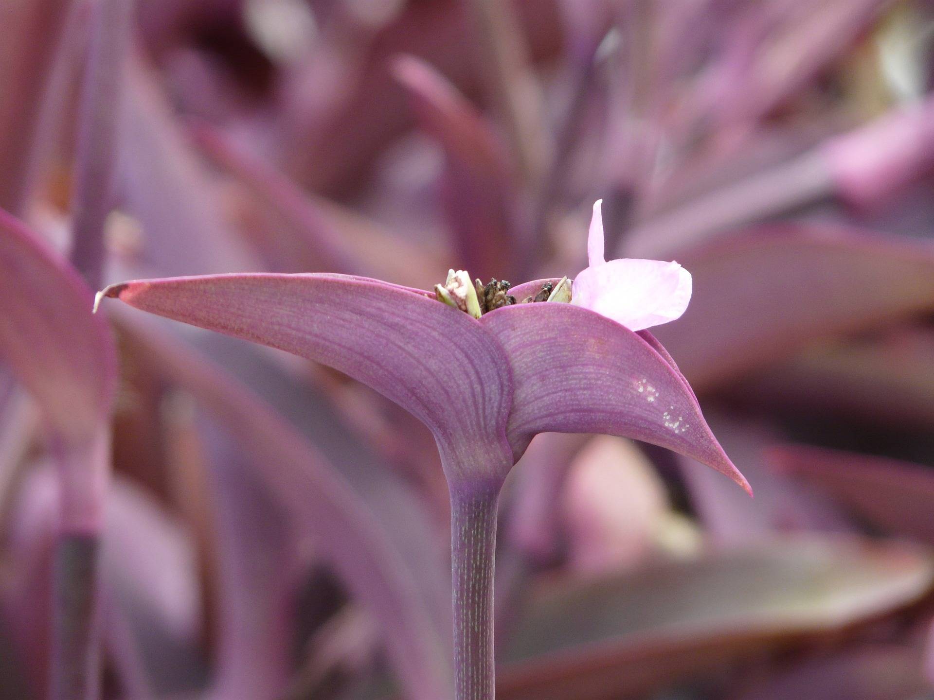 Традесканция Фиолетовая отличается оригинальным окрасом — мелкие цветки растут в окружении удлиненных листьев темно-фиолетового оттенка. Ее также называют розовой традесканцией из-за нежного окраса лепестков.