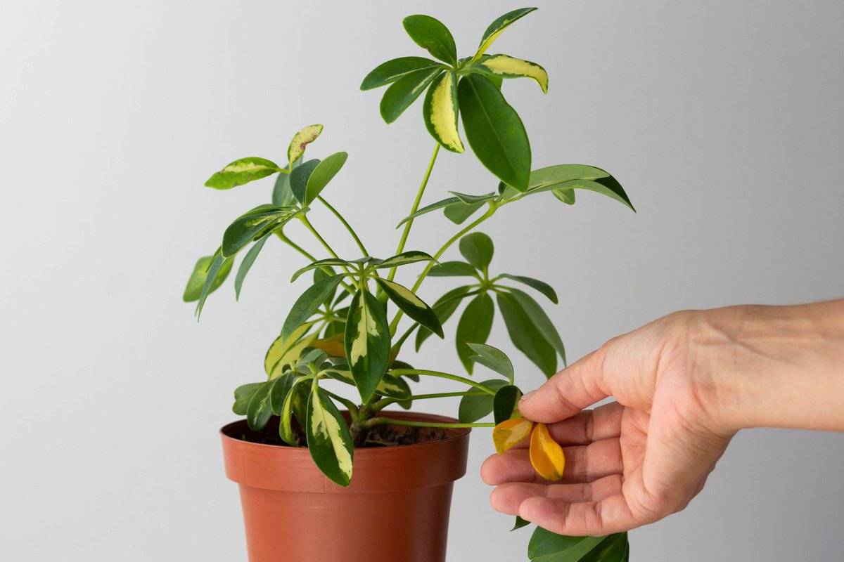 Часто причиной нездоровой «внешности» цветка являются погрешности в уходе за ним. Если листья покрываются пятнами, чернеют, опадают, а шефлера засыхает — скорее всего, ей не хватает влаги. Увеличьте полив, но следите, чтобы вода не застаивалась у корешков. Гниение корневых отростков тоже может спровоцировать увядание листвы. Поэтому во время посадки и пересадки помните о хорошем слое дренажа.