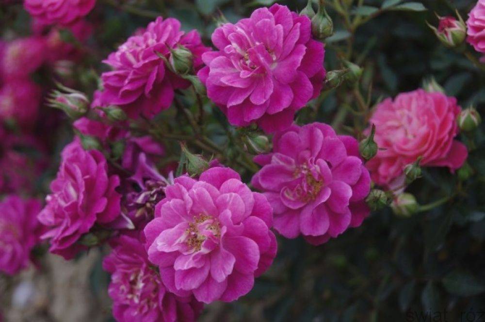 Напоминает шиповник: цветки простые, насыщенно-розовые, собраны в шаровидные соцветия. Зацветает поздно, но бутоны образуются до поздней осени.