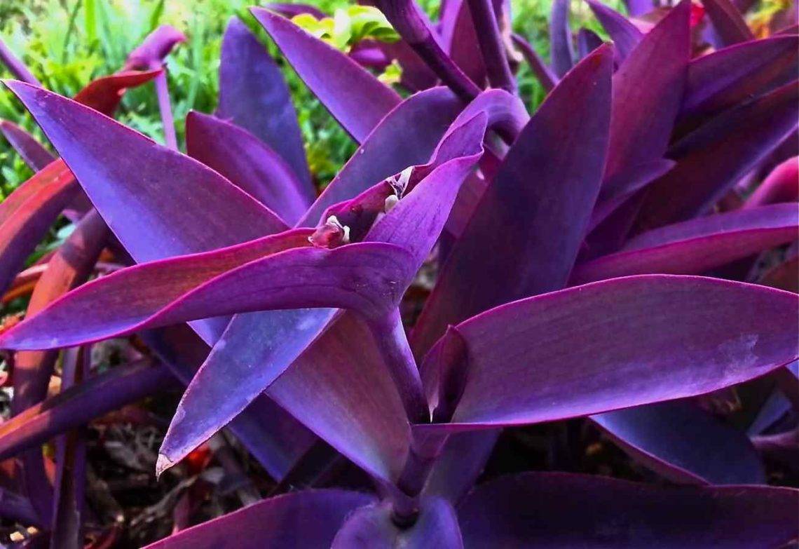 Традесканция домашняя покрывальчатая используется как в садовом дизайне, так и для домашнего озеленения. Это остролистые розетки, удлиненные листья которых направлены строго вверх. Цвет внешней стороны листа зеленый с белыми прожилками, нижней – фиолетовый.