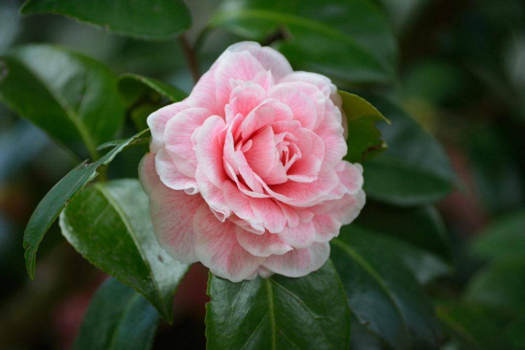 Камелия японская (Camellia japonica). В естественных условиях данный вид водится в лесах Китая, Японии и Кореи. Эти кустарники или деревья в высоту могут доходить до 15 метров. Блестящие, кожистые листочки темно-зеленого цвета имеют зубчики по краю и являются остроконечными на вершине. Форма у них эллиптическая или яйцевидная, а в длину листья вырастают до десяти сантиметров. Простые цветочки в диаметре доходят до 4 сантиметров и могут расти как отдельно, так и по несколько штук. Водятся цветки полумахровые и махровые, а пигментированы они в розовый, красный или белый цветовой оттенок, а также водится и пестрая окраска. Расцветает с декабря и по апрель.