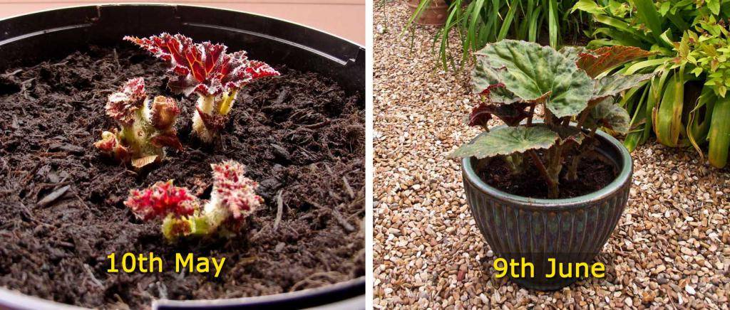 Размножение клубневой бегонии черенками, может быть осенним и весенним. Для весеннего черенкования клубни бегонии нужно «разбудить» в январе-феврале, переместив их в тёплое помещение. Срезать черенки с них можно только тогда, когда на ростке появится как минимум три листика. Делать это нужно очень острым ножом или бритвой, оставив один листик на клубне – его нужно обязательно оставлять, чтобы растение не погибло. Места срезов черенков необходимо обработать и высадить их в почву, поддерживая в помещении температуру +20 +22 градуса и влажность воздуха 60%-80%.