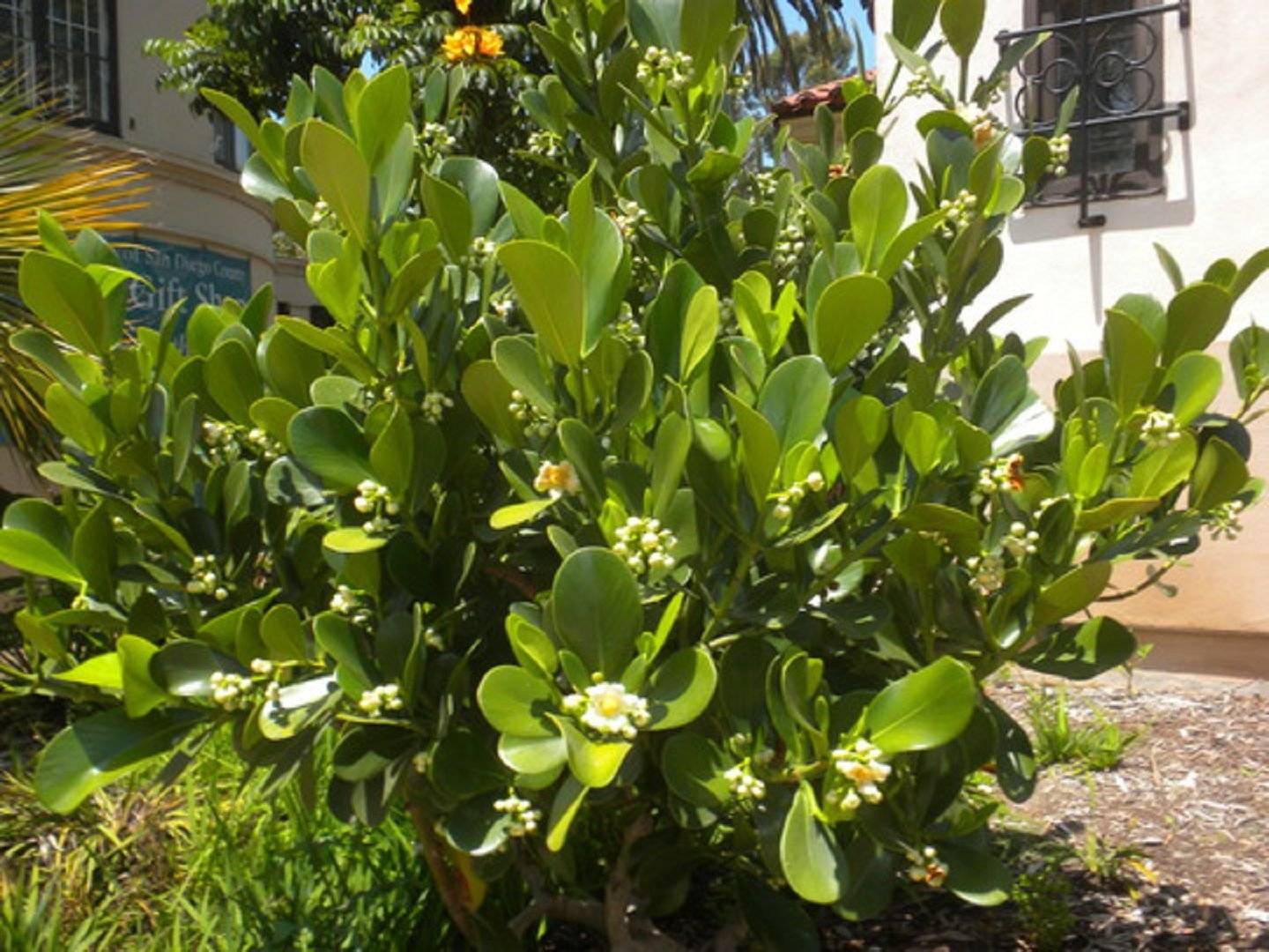 Дерево или кустарник высотой 2-3 м занимает диаметр около 1,2 м. Листовые пластины обратно-яйцевидной формы в длину вытягиваются на 8-15 см, они прикреплены на коротких мясистых черешках. Цветы молочного или кремового оттенка диаметром 5-8 см. Они раскрываются на верхушках побегов одиночно или собираются в кистевидное соцветие по 3-5 шт.