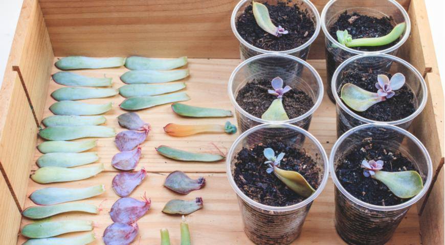 Можно укоренять мясистые листовые и стеблевые черенки суккулентных растений и вовсе без субстрата, просто бросив мясистые листья суккулентов в теплое и светлое место.