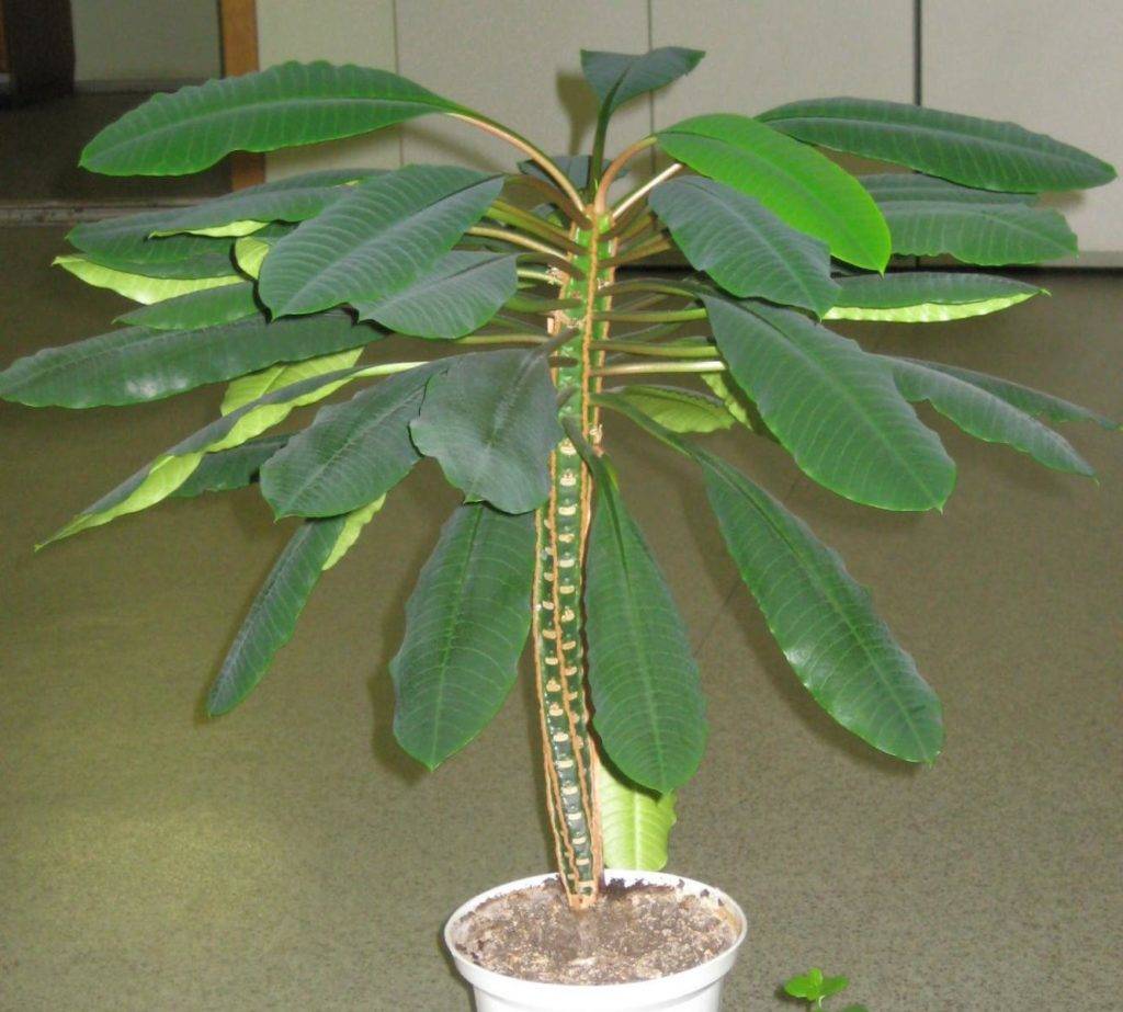 По внешнему виду цветок молочай euphorbia представляет собой толстый ствол (иногда четырехугольной формы). Листья овальные, крепятся на длинной ножке. Прирост новых осуществляется вверху, нижние постепенно отмирают, оголяя ствол.