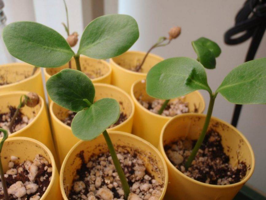 Для начала необходимо слегка перетереть посевной материал. Это делается для того, чтобы немного сточить достаточно толстую оболочку. Затем в разрыхленный грунт, сделав бороздки глубиной 45 мм, сеют посадочный материал. Можно использовать для заглубления любой нетолстый предмет, который позволит вдавить семена в почву, например карандаш. Чаще всего их просто выкладывают в горшок, присыпая равномерным слоем песка или грунта. После этого тару переносят в прохладное место на 12-14 суток, предварительно накрыв пленкой. По мере необходимости при помощи пульверизатора следует увлажнять почву. Спустя 14 суток емкость с семенами переносят на подоконник. Спустя 2,5-3 недели после посадки появляются первые всходы. Их можно чуть-чуть проветривать. Затем делают пикировку и каждый сеянец пересаживают в отдельный горшок.